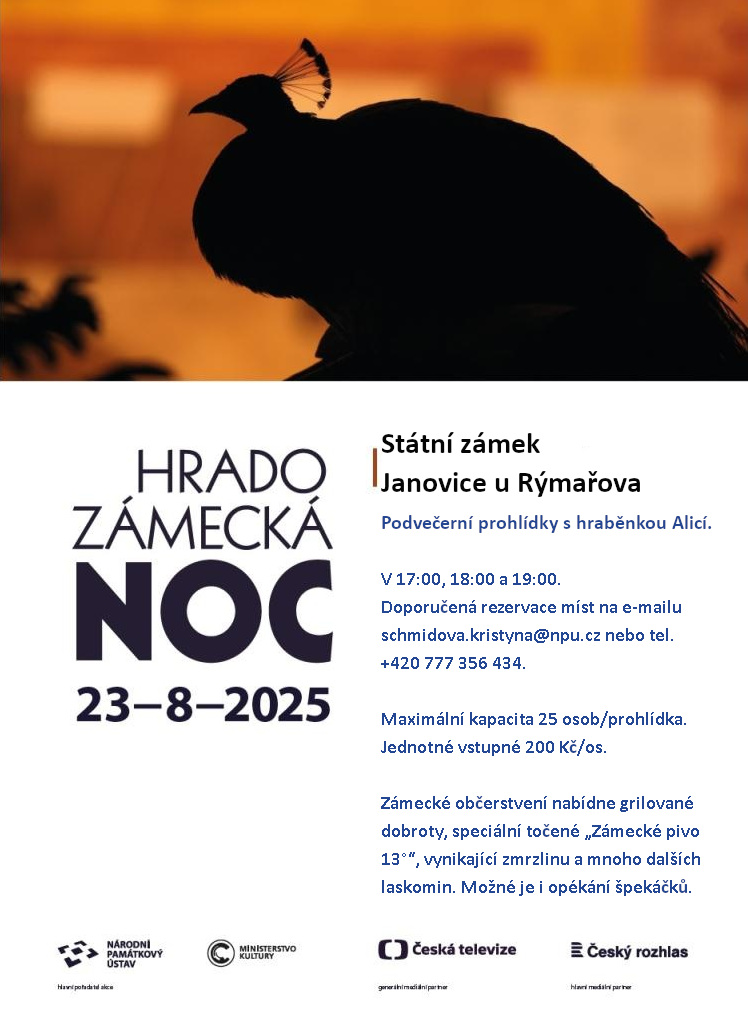 Zámek Janovice u Rýmařova se i v letošním roce připojuje k akci Hradozámecká noc. V sobotu 23. srpna 2025 proběhnou podvečerní prohlídky s hraběnkou Alicí. A to v 17:00, 18:00 a 19:00. Doporučená rezervace míst na e-mailu schmidova.kristyna@npu.cz nebo tel. +420 777 356 434. Maximální kapacita 25 osob/prohlídka. Jednotné vstupné 200 Kč/os.